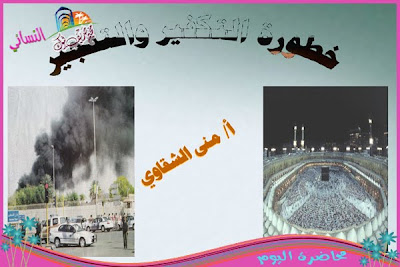 بعد العشاء : محاضرة للأستاذة منى بعنوان : خطورة التكفير والتفجير وتناولات فيها : أمر الله بالاجتماع والائتلاف ونهيه عن التفرق والاختلاف –تمثل الصحابة لأمر الله – عدم تكفير الصحابة لبعضهم عندما حصل القتال بينهم ولم يفسق بعضهم بعض ..