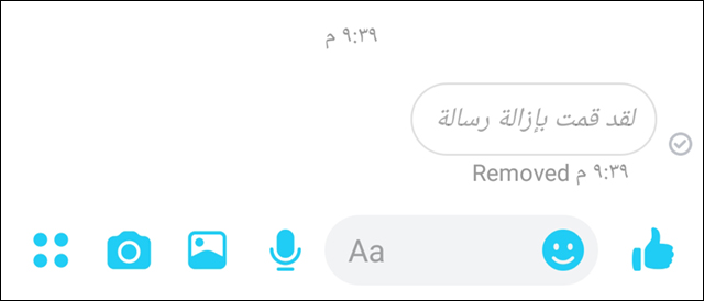 الآن ولنفترض أنك قمت بإرسال رسالة بالخطأ إلى شخص ما أو فى جروب دردشة على تطبيق ماسنجر، كل ما عليك فعله قبل مرور 10 دقائق (المدة المسموح لك فيها بحذف الرسالة) هو النقر مطولًا على نص الرسالة التي تريد إزالتها، ثم النقر على خيار "إزالة" من الشريط السفلي. بعد ذلك سوف يسألك "من الذي تريد إزالة هذه الرسالة لديهم؟" فأضغط على "إزالة لدي الجميع" وأكد الأمر بالنقر على زر "إزالة".